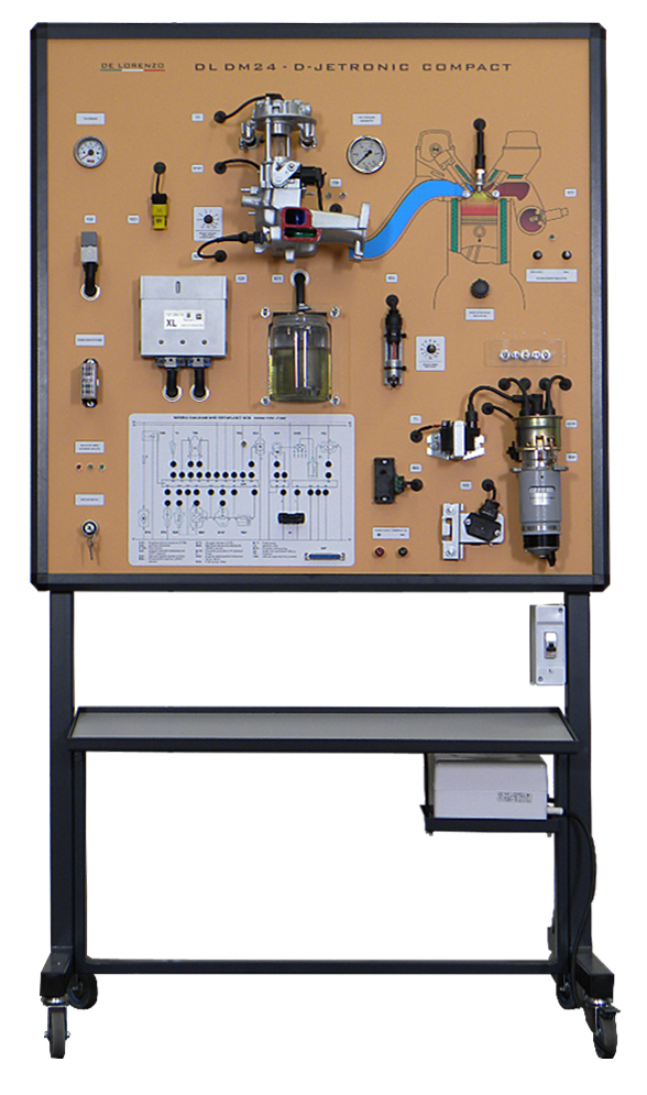 This demonstration stand is designed to reproduce the performance of the D‐Jetronic mono‐point injection engine system and the MULTEC electronic determination of the advance angle, as well as the representation of the control of the engine system in changes of the fuel dose and the advance angle, as far as the temperature, the rotational speed, the load and many more related parameters