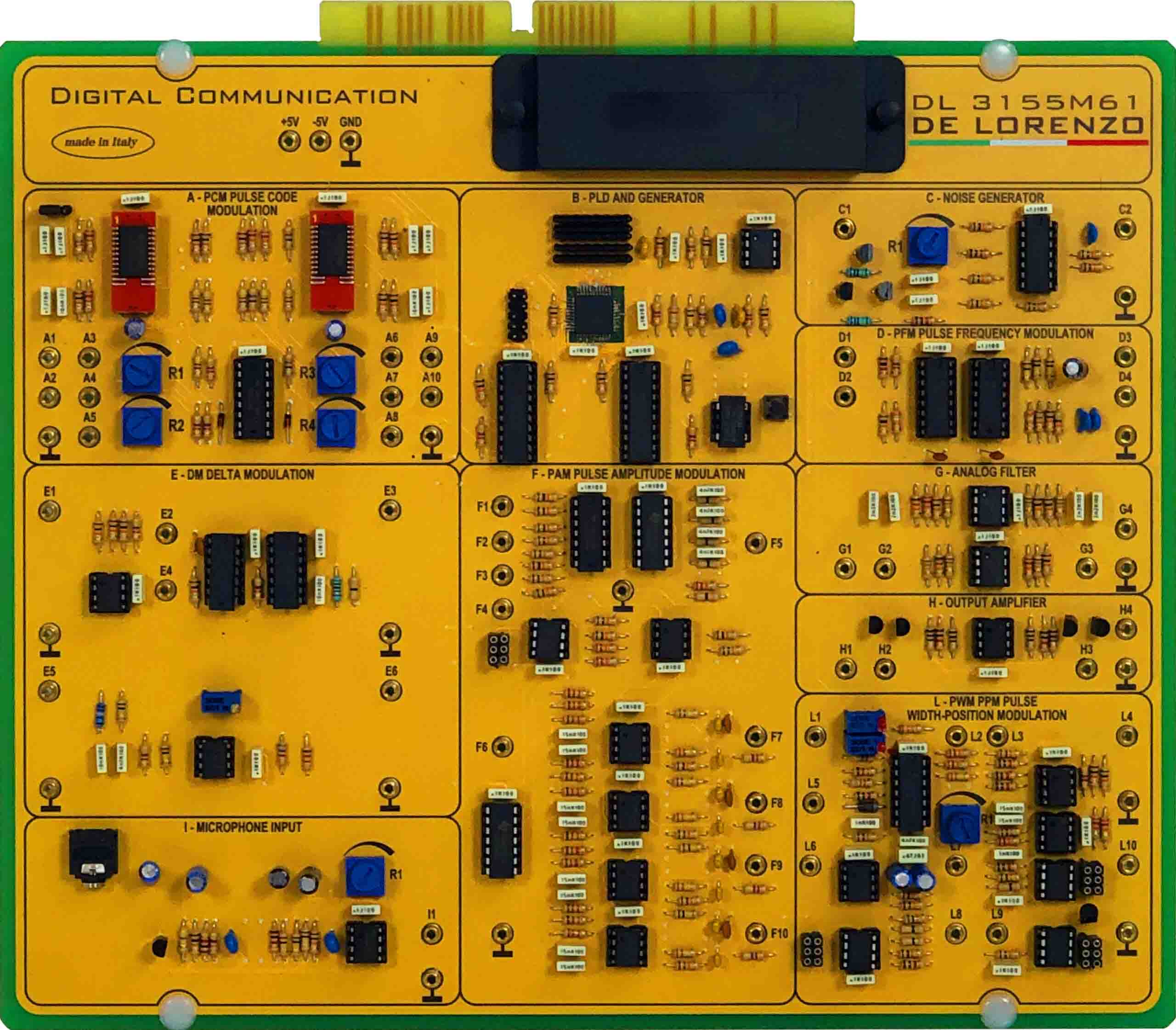With this board the students can study the operating principle of the digital communications using the most common techniques such as PCM modulation, PAM modulation, PFM modulation, PWM and PPM modulations and finally the DM modulation with the aid also of a signal of noise, of analog filters and output amplifiers