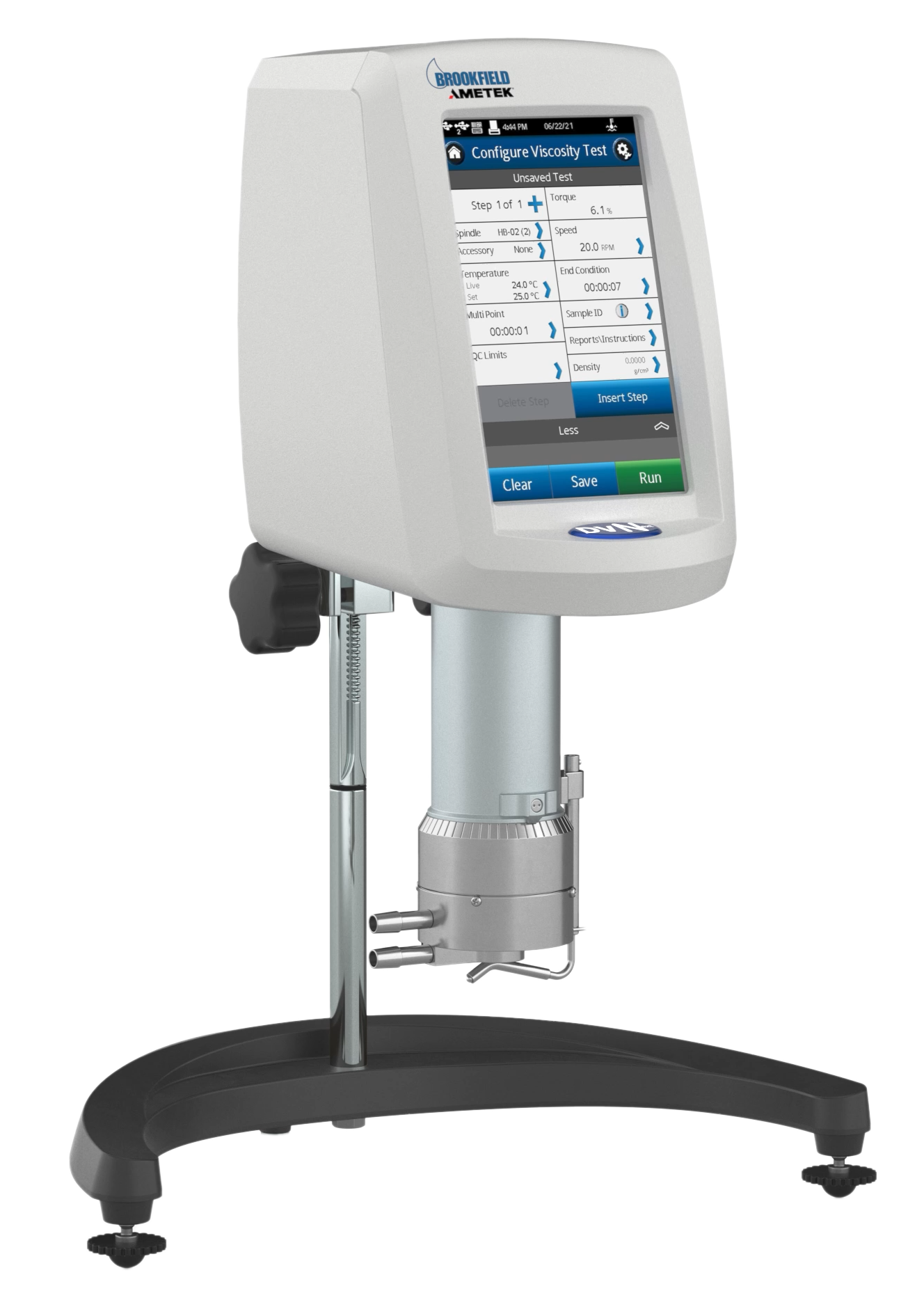DVNext Cone/Plate Rheometer operates by measuring the torque required to rotate a cone spindle immersed in a small sample volume of fluid. The resistance to the cone’s rotation, caused by the fluid, is directly proportional to the shear stress. This torque is then used to calculate the fluid’s absolute viscosity in centipoise (mPa·s). The precise relative position between the cone and plate is maintained through a simple mechanical setup without the need for external gauges.