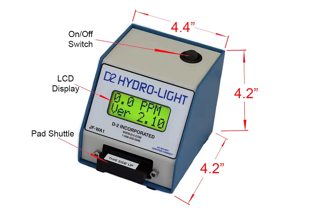 D-2 Inc. is pleased to introduce the JF-WA1 Hydro-Light ASTM D3240 Digital Free Water Detector for Jet Fuel. This device revolutionizes testing free water in aviation fuel. Hydro-Light provides results efficiently with an easy one step measurement process. Just put the pad on the slide, put the slide in the machine and read the digital display, which displays the free water content of the fuel up to 50 PPM. This box is used to run the ASTM Test Method D3240. The Hydro-Light improves the accuracy and reliability of the ASTM D3240 test method by removing human error and providing digital results.