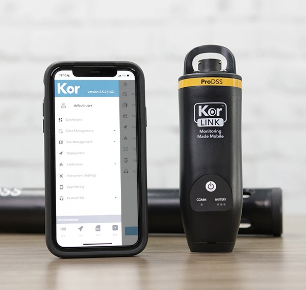 The ProDSS KorLink is a Bluetooth adapter that connects effortlessly with any ProDSS cable assembly for water quality sampling. It allows you to access your data on a mobile phone, tablet, or laptop, replacing the need for a handheld meter via Kor Mobile or Kor Desktop software. It is compatible with Apple, Android, and Windows devices and serves as an alternative tool for collecting and viewing discrete sampling measurements.