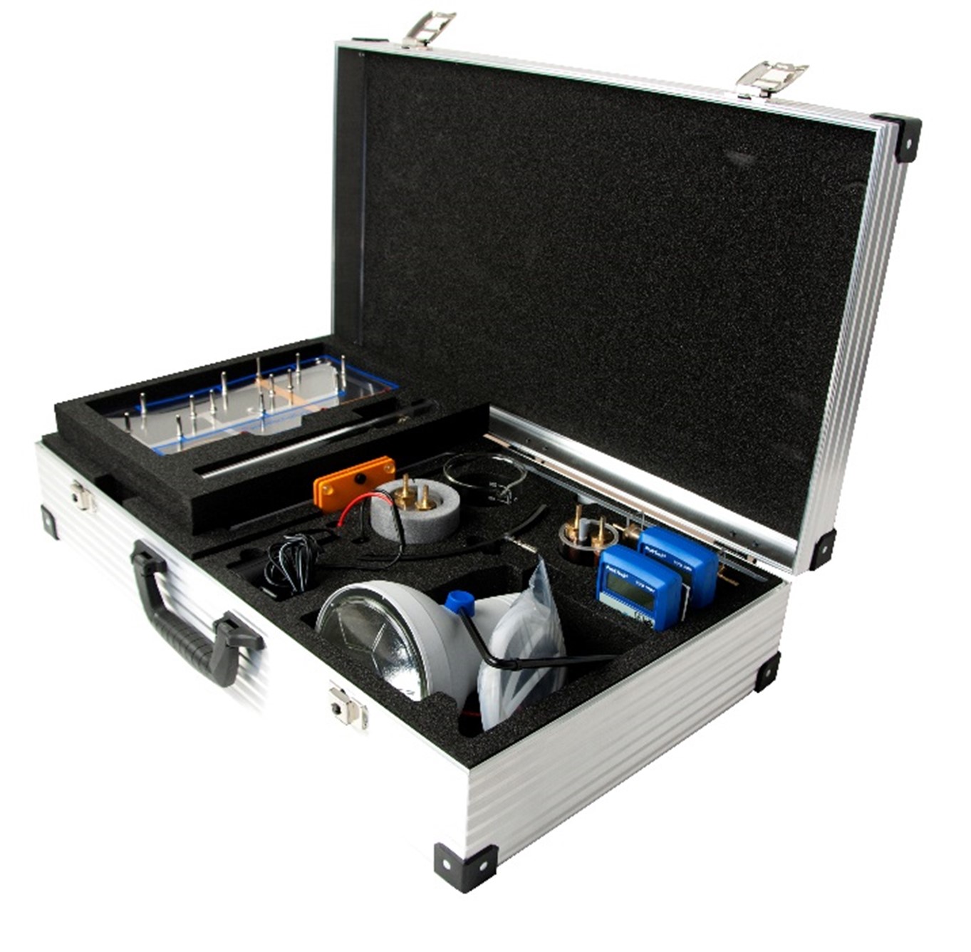 This kit provides a basic understanding of solar thermal energy conversion. The most important component is the solar collector, which can be powered both by sunlight as well as by the infrared light source.