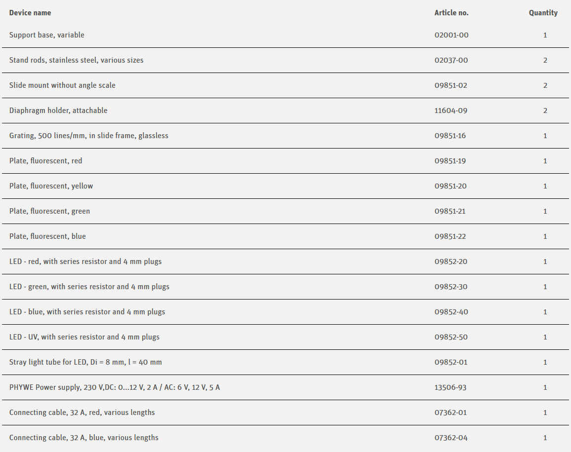 For carrying out this experiment the room should be rather dark, particularly for the part where the spectrum is viewed through the grating. It is important not to look directly from the front into the light cone. If you have a problem seeing a colour there is the further option of slightly increasing the distance between the fluorescent screen and the tube and viewing the colour of the light spot on the screen. In this case only that part is reflected which does not contribute to the fluorescence.