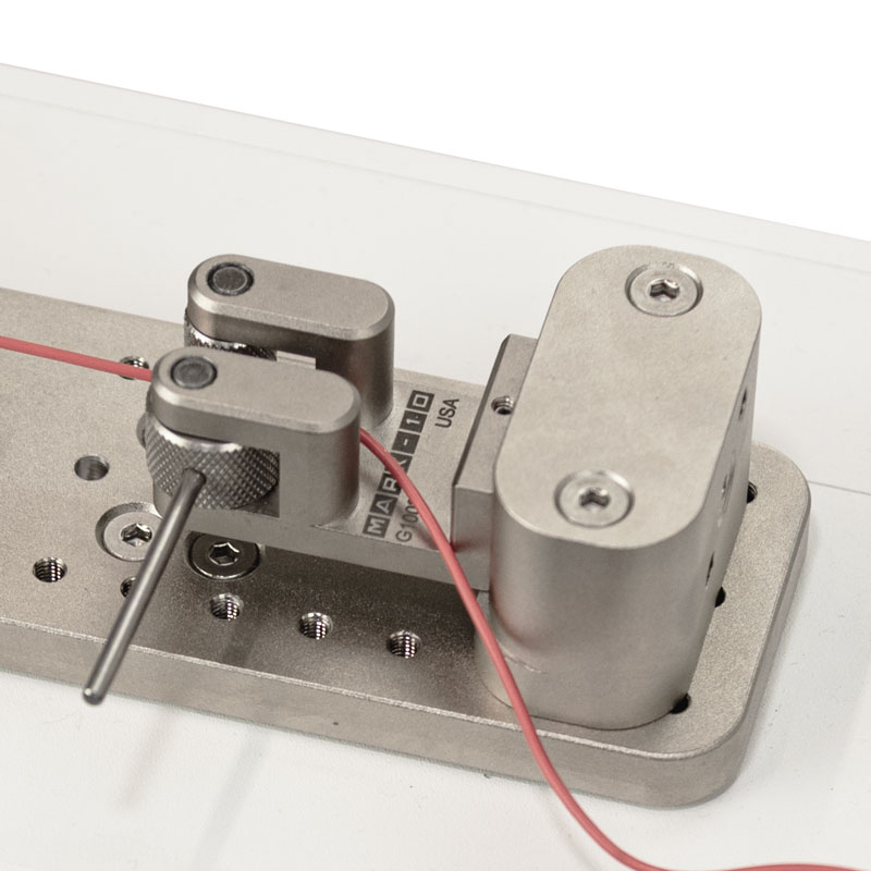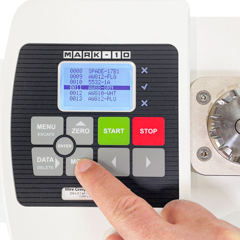 Measure wire crimp pull forces up to 200 lbF [1 kN] accurately and efficiently with the WT-205M motorized pull tester. Portable and customizable, the tester conforms to numerous UL, ISO, ASTM, SAE, MIL, and other requirements for destructive and non-destructive testing. Pull to break, pull to load, or maintain a load for a specified period of time (optional functions), as per the requirements of UL 486A/B. Programmable pass/fail limits with red and green indicators and audio alerts help identify non-conforming samples. The tester’s standard adjustable terminal fixture contains multiple slots for diameters up to AWG 3 (0.25 in [6.3 mm]), while the self-tightening wedge grip securely clamps the free end of the cable. To accommodate a wide range of materials, optional and interchangeable alternative grips are available. Samples can be sent to Mark-10 for evaluation and recommendation prior to purchase. The WT-205M stores and calculates statistics for up to 2,000 readings, with available date and time stamps for each saved data point. Data can be transferred to a PC or other data collector via USB, RS-232, Mitutoyo (Digimatic), or analog outputs. Upon sample break, the tester can auto-reverse, save and output the peak force, and auto-zero in preparation for the next test, increasing testing efficiency. The available Profiles function allows the user to create and save test setups for quick recall. The WT-205M includes MESUR® Lite data acquisition software. MESUR® Lite tabulates continuous or single point data. One-click export to Excel allows for further data manipulation.